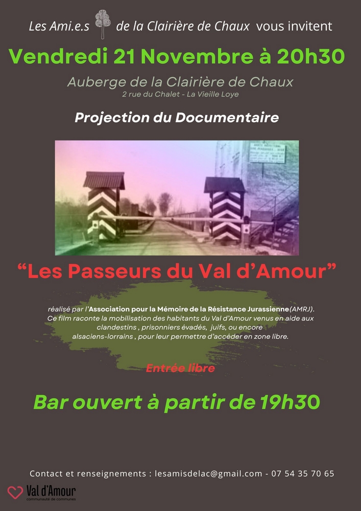 Le vendredi 21 novembre à 20h30 à l'hôtel La Clairière de Chaux Diffusion du film " Passeurs du Val d'Amour - Quand la Loue était une frontière " suivi d'une discussion et du verre de l'amitié offert par notre association. |